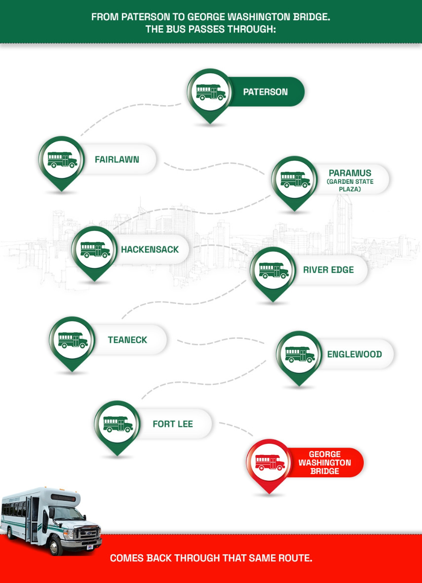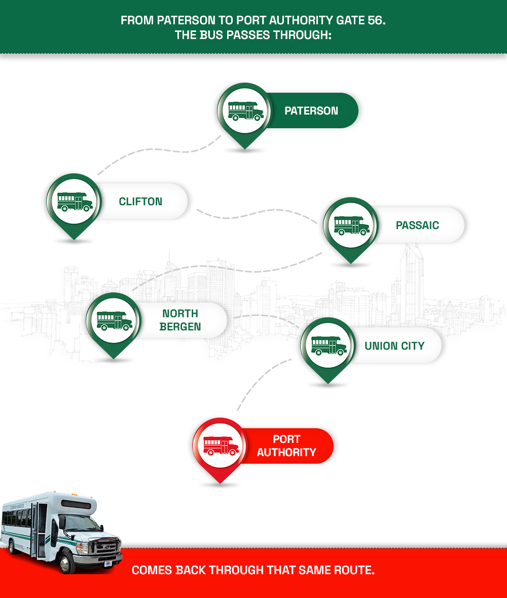 Express Bus Service supports daily riders traveling from Paterson, Clifton, Passaic, Union City, and nearby North Jersey communities into New York City.